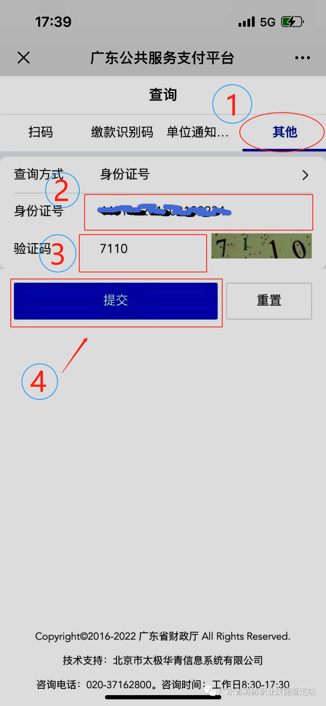 3、 在“广东公共服务支付平台”的页面点击 “其他”,输入缴费人员的身份证号码和验证码后,点击“提交”,跳转至开具的“已缴费”页面