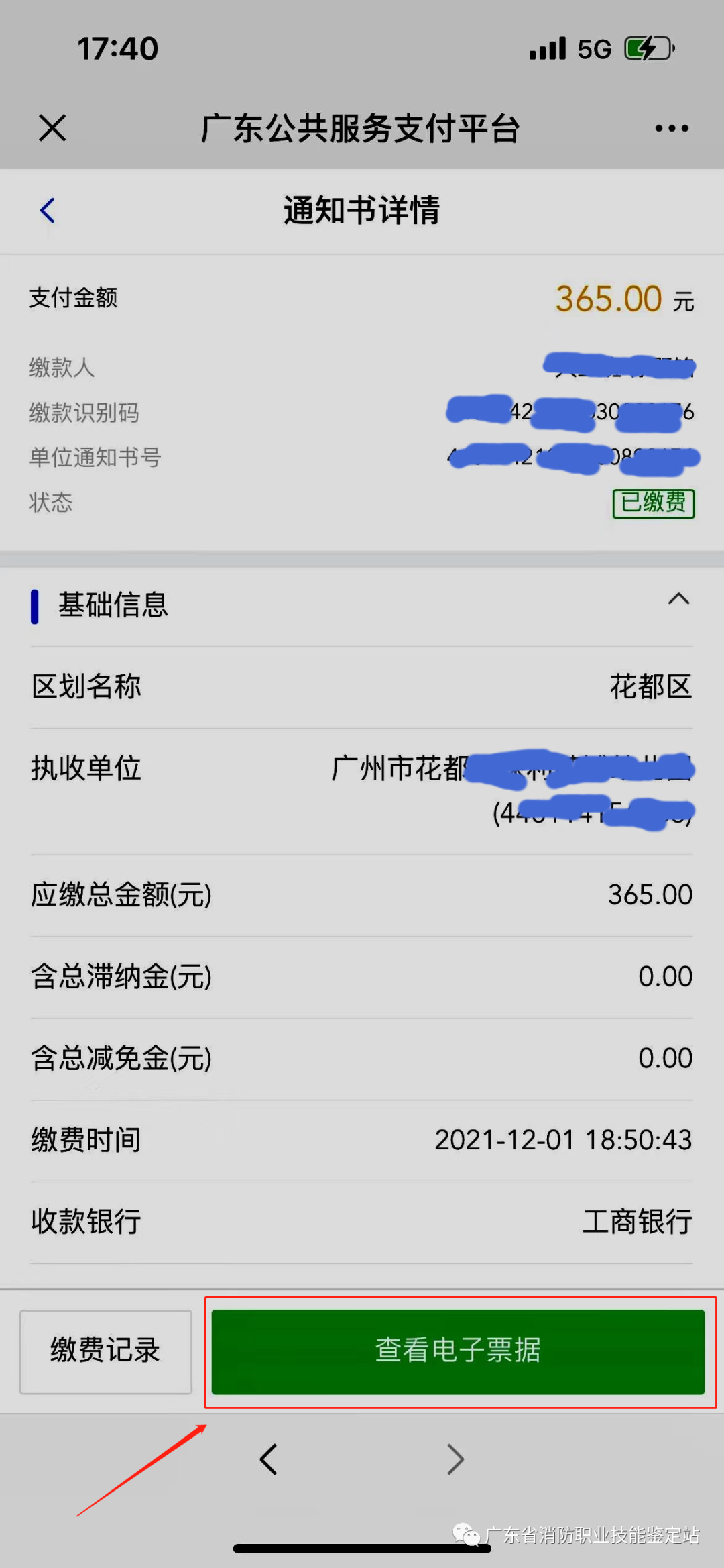 4、 找到需要开具的票据,点击 “已缴费”,进入票据详细内容页面,确认无误后点击“查看电子票据 ”,页面跳转至开票网站