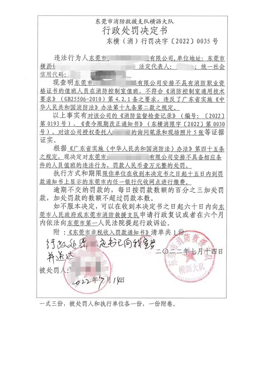 2022年7月6日,横沥大队消防监督员进行监督检查检查时,发现位于东莞市横沥镇康乐路某工业区的 消防控制室值班人员对主机操作流程不熟练且均未取得相关消防职业资格证书 ,违反了广东省实施《中华人民共和国消防法》办法第十九条第二款之规定。